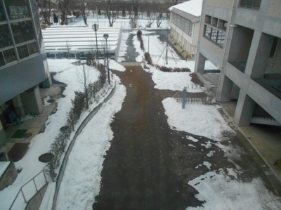 この場所は、校舎の影になり、太陽の光が届かず、雪が解けにくい場所です。