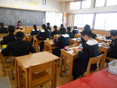 いつもは向かい合って、グループで食べますが、インフルエンザが