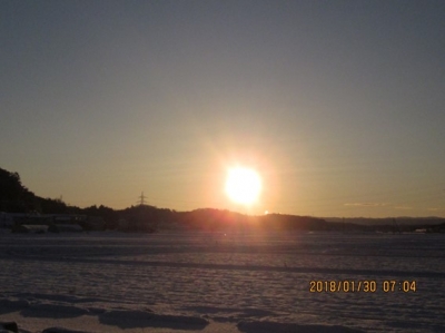2018年1月30日 19時23分太陽はすっかり山の影なのに、校舎の外に出ると、とても明るいです。