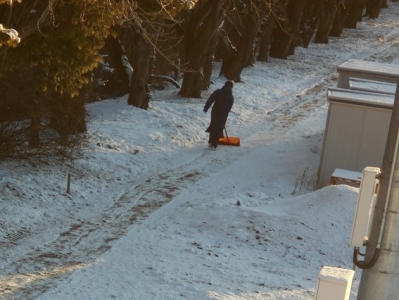 2018年1月30日 08時18分一人クロスカントリーロードに向かう道を雪はきする職員の姿が・・・