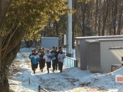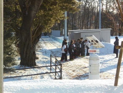 どうやら、クロスカントリーロードで走っている生徒を待つうちの雪かきのようです。(そこの雪道は生徒たちで、雪かきをしたそうです。)