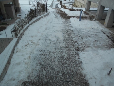 氷点下の割には解けていますが・・。 玄関に行くまでの道に雪が残っています。