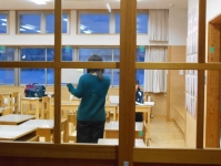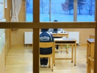 各クラスでは、椅子に座って静かに聞きます。