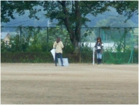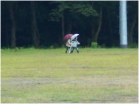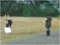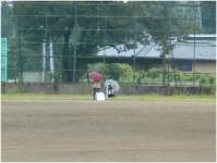 よく見ると女性二人が校庭の端に傘を差しながら何かをしています。