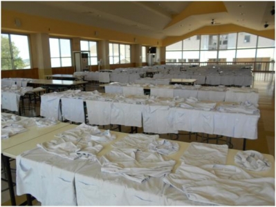 ランチルームのすべてのテーブルに給食の白衣・帽子・袋が干してありました。