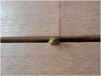 外はもう朝から暑いので、日陰で涼を求めている?しかも板と板の間にはまっています。