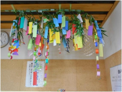 2017年7月7日 17時07分今日は七夕です。廊下に飾られた笹の葉につけられた短冊が増えていました。