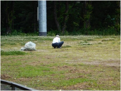 園芸の匠が、先日の奉仕作業で取り残されたクローバーを取っています。
