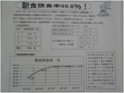先週給食委員会で調査していた「朝食を見直そう週間」での朝食摂取率が給食・食育だよりで