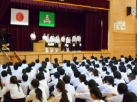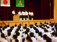 初めは校長先生と全校生徒の朝の挨拶。それが終わると表彰が始まります。