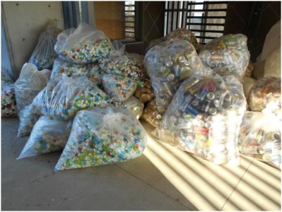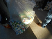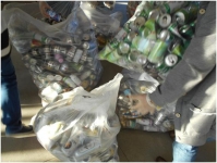 空き缶のアルミとスチールを分別です。 ペットボトルのキャップをまとめます。