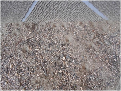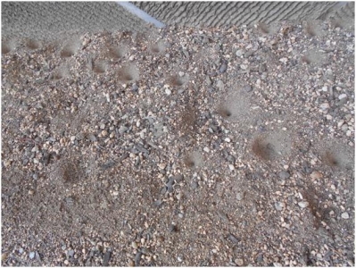 2017年9月9日 08時30分雨が吹き込まない部分地面をみていたら、たくさんのアリジゴクの巣をみつけました。