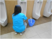 清掃中の看板を立てて清掃開始です。 青い薬剤(尿石等を溶かす薬)を入れておきます。
