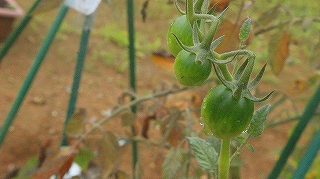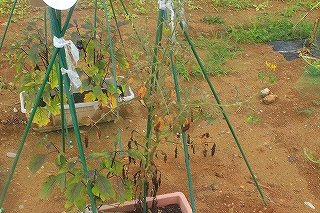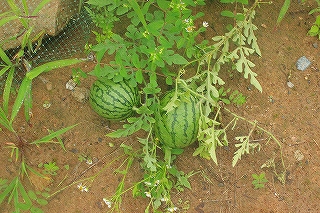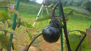 2017年8月21日 09時30分 最近日照不足、雨ばかりで心配していました。トマトは緑で葉は茶色寄りの緑で、トウモロコシは枯れかけていました。一方、ナスは小さい実がなっていて、スイカは実が増えていました。そのため、トウモロコシは近いうちに撤去、トマトは様子を見てダメなようであれば撤去という形にしました。8月3日にパソコン部で畑の野菜を使ったカレーを作り、畑の野菜を食べることができたので、よかったです。
