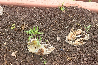 ↑トマトを見ていたら、鳥に食われたため落としておいた実から芽のようなものが生えていました。