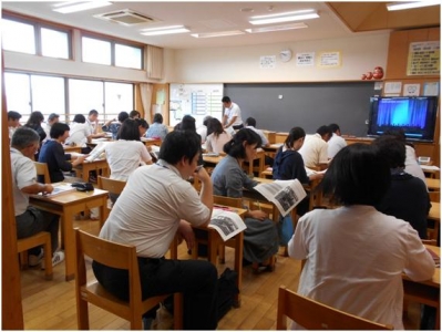 ひとつの教室にたくさんの先生方が集まって研修です。
