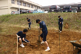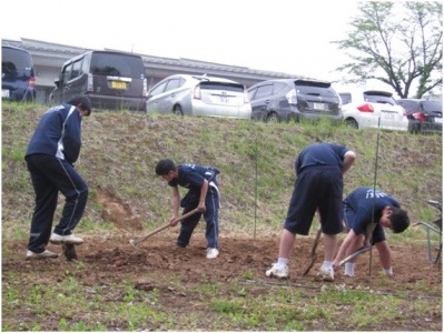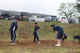 2017年5月25日 17時45分学校の職員駐車場の下にある荒れ地で、パソコン部がスコップや一輪車をお供に