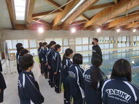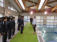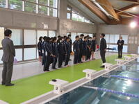 2023年5月1日 18時17分本日放課後、水泳部の生徒を中心にプール開きを行いました。水温14℃、気温20℃と、まだ水泳に適した条件は整っていませんが、もう間もなく水泳ができそうなので、本日プール開きの式を行いました。本校は、室内プールの施設があるので大変恵まれています。事故なく、充実した活動ができるように祈ります。