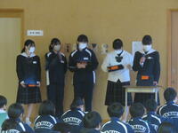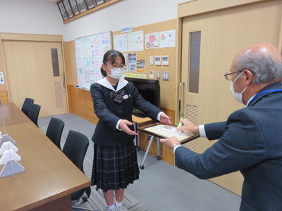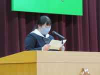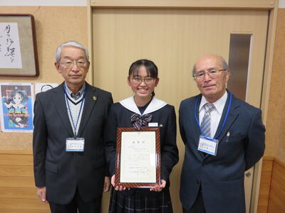 2022年12月21日 15時32分今年行われた第41回全国中学生人権作文コンテスト福島県大会において、兜森はなさん(1-4)が「奨励賞」を受賞しました。これをうけて、昨日20日(火)には、白河人権擁護委員協議会副会長の佐藤正弘様、同人権擁護委員の陣野秀敏様が来校され、受賞者のはなさんに直接賞状と副賞を手渡していただく授賞式を実施しました。受賞おめでとうございます。