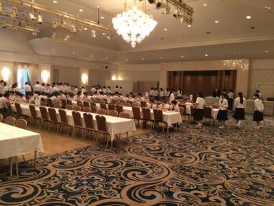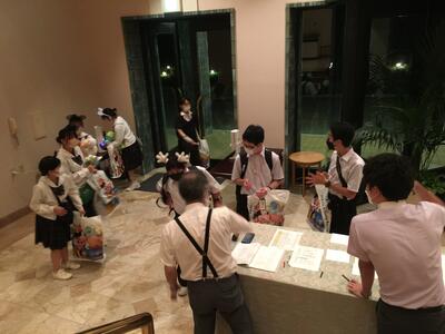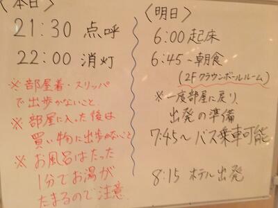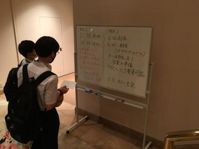 2022年9月15日 20時11分ディズニー・シーを満喫して、全員無事に戻ってきました。矢吹中学校専用のチェックインテーブル前です。ホテルでの過ごし方を書いたホワイトボードを見て確認したら部屋に向かいます。今晩は10時消灯ですよ。おやすみなさい。