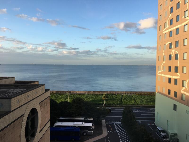 2022年9月16日 06時05分おはようございます。ホテルの窓からは、東京湾の様子が眺められます。遠く「海ほたる」が見えます。今日も天気が良さそうです。
