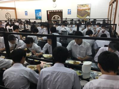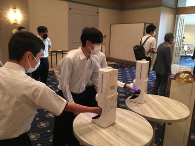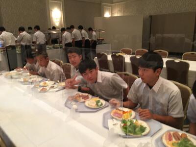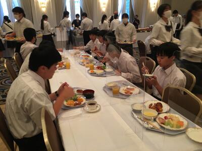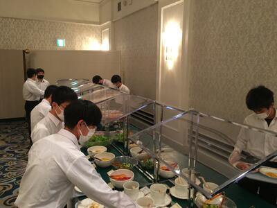 時間になると朝食会場に続々と集まって来ました。検温して消毒もします。朝食はバイキング。感染防止のため手袋をして好きな物を取ります。