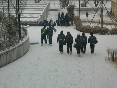 生徒たちが帰る道もサラサラ雪なので、足跡も白いです。