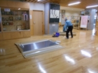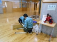 2018年1月11日 15時23分職員室入口(出口)の廊下で教材業者の方2名、段ボールを開いて中から取り出しています。