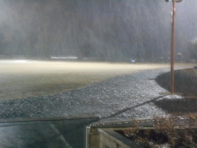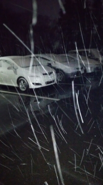 周りが暗いためか、沢山積もっているように見えます。実際は1㎝位でしょうか。それいかにも見えます。積もったのが車体の上だけで良かった。