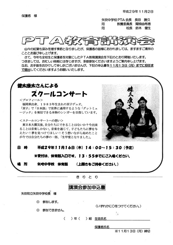 2017年11月9日 10時21分11月16日(木)午後2時から3時30分までPTA教育講演会が催されます。