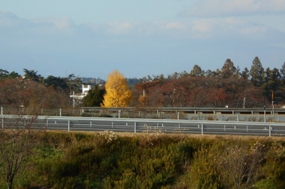 阿武隈高原道路の向こう側に目立つ黄色。イチョウの木です。