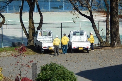 庭の匠が落ち葉を集めていました。