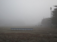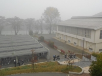 当然登校する生徒も霧の中。