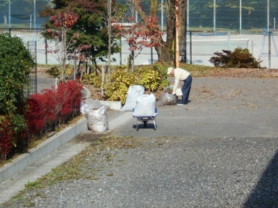 手には緑色の箒と塵取りを持っての作業です。