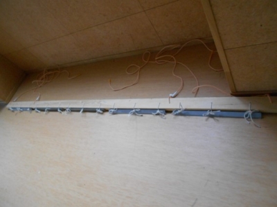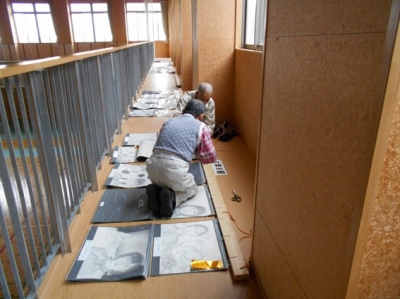何をしているのかなと目を凝らしてみていると、生徒たちの作品をつるすべく、作業をしているところです。
