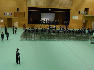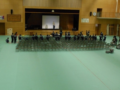 リハーサルをしている生徒の手を借りて敷きます。6校時はまだこの状態です。