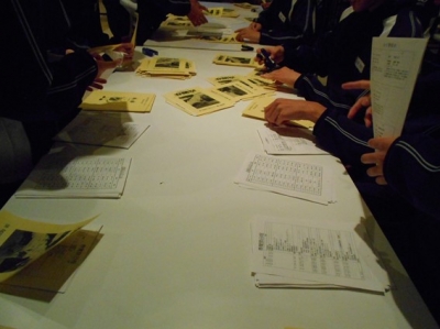 何百枚のもの紙を帳合して綴じていきます。何百枚あっても、大勢の生徒たちの手にかかると、たちまち出来てしまいます。