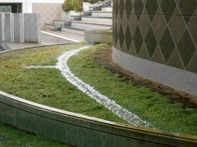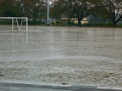 校舎の中庭も屋根からの雨水で、音を奏でています。