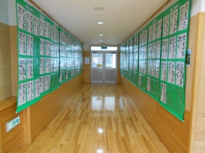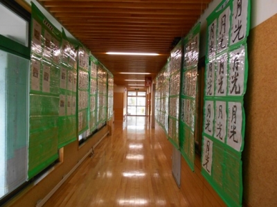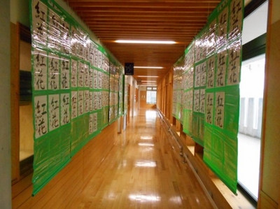 2017年10月19日 12時17分体育館へ行く廊下の壁に生徒たちの作品が展示されました。