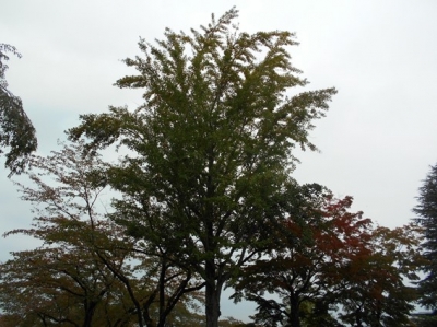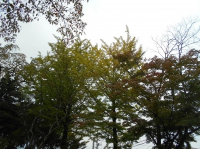 雄のイチョウの葉が黄色くなってきたのですが、雌の木はまだ紅葉していないのです。