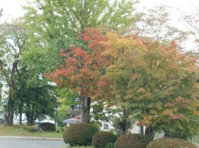 2017年10月11日 12時03分校舎の木々が少しずつ紅葉してきました。実がならなかったせいもあり、