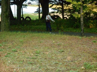 いつもより、音が甲高いのは、校庭より石が多のでしょう。(草刈り機の歯が石と擦れる音です。)