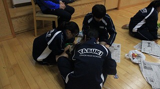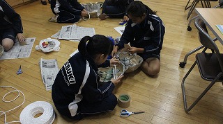 上の写真は、3年生です。3人で新聞紙で包んでガムテープを貼って強度のあるくす玉を作っていました。