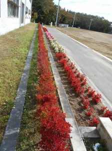 花壇のつつじも、ベコニアと競うかのように赤く紅葉しています。