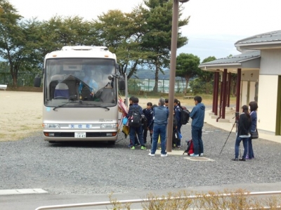 2021年4月28日 13時30分フィールドワークでは、バスの中でガイドさんに説明していただきながら、浪江町と双葉町をまわります。