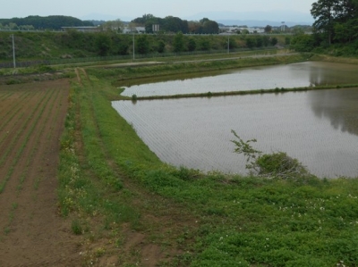 5月下旬ころの田んぼです。まだ田んぼに張った水が見えます。