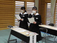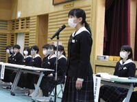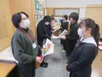 2024年3月14日 14時49分先週6日(水)は、今年度最後の「読み聞かせ」の時間となり、ボランティアで活動していただいた方々に感謝の言葉を伝える「感謝の集い」を実施しました。全校生徒を代表して図書委員会委員長の小針綺夏さん(2-1)が「とても印象深く読み聞かせを楽しみました。また来年もお願いします」と感謝の言葉を伝え、代表の委員達で花束を贈呈しました。