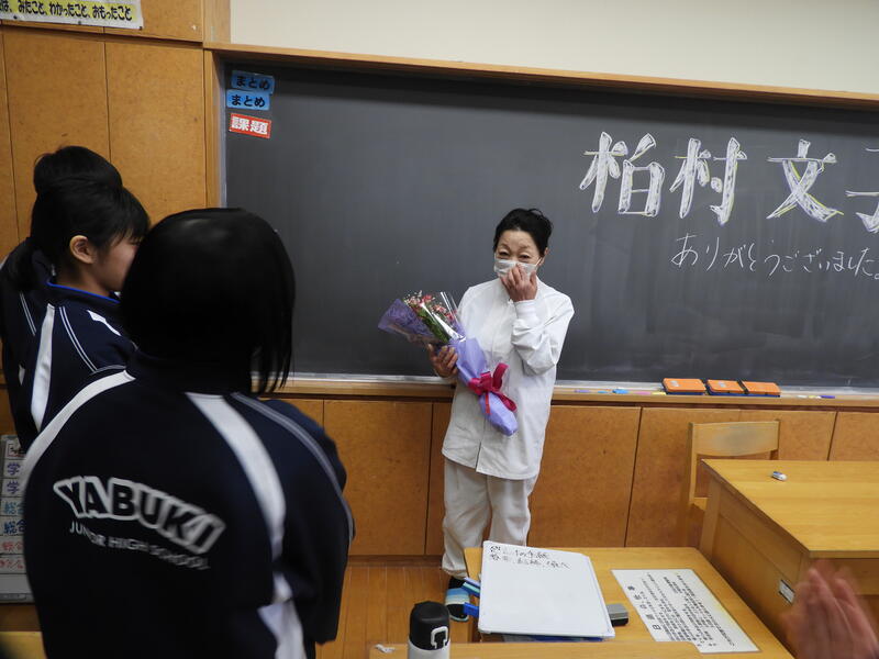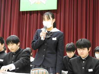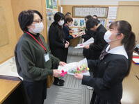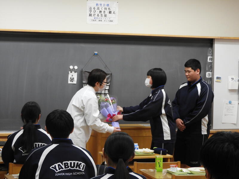 2024年3月12日 19時12分3月12日(火)は、3年生のとって最後の給食の日となりましたので、「給食感謝の集い」を行いました。3年間給食を作ってくださったことへの感謝の気持ちを込め、各学級の給食委員が、調理員の方々に花束を贈りました。調理員の方々からは、「人生最後の給食です。おいしく味わって食べてください。」「これから先、いろいろな困難があるかもしれませんが、諦めずに頑張ってください。応援しています。」といったお言葉をいただきました。
