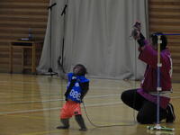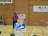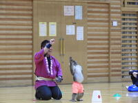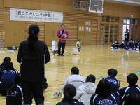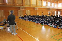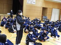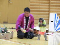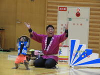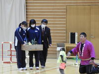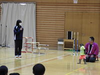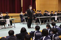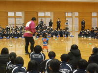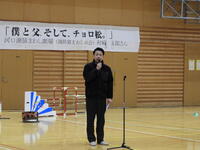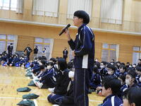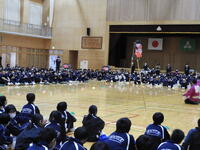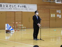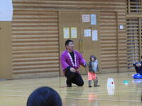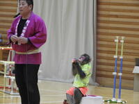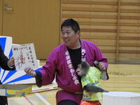 2024年2月29日 17時37分先週2月22日(金)6校時にPTA教育講演会を実施しました。新型コロナウイルス感染症感染防止対策のため4年ぶりの開催となりました。講師として河口湖猿まわし劇場(周防猿まわしの会)の村崎五郎様をお招きしました。実際に猿まわしを行うため、相棒のニホンザル「チョロ松」君を伴っての来校でした。1時間半ほどの講演の内、前半はチョロ松君との猿まわし芸を楽しませていただきました。ニホンザル特有のかわいらしさと共に棒高跳びや玉乗り、竹馬乗りなどの芸に、ハラハラドキドキしながらも拍手喝采の連続で盛り上がりました。後半は「僕と父。そして、チョロ松」と題して、猿まわしの再興に尽力した父親との話、猿に芸を仕込み、一緒に生活する上での裏話、教えることと学ぶことなどのお話をいただき、充実した時間を過ごしました。