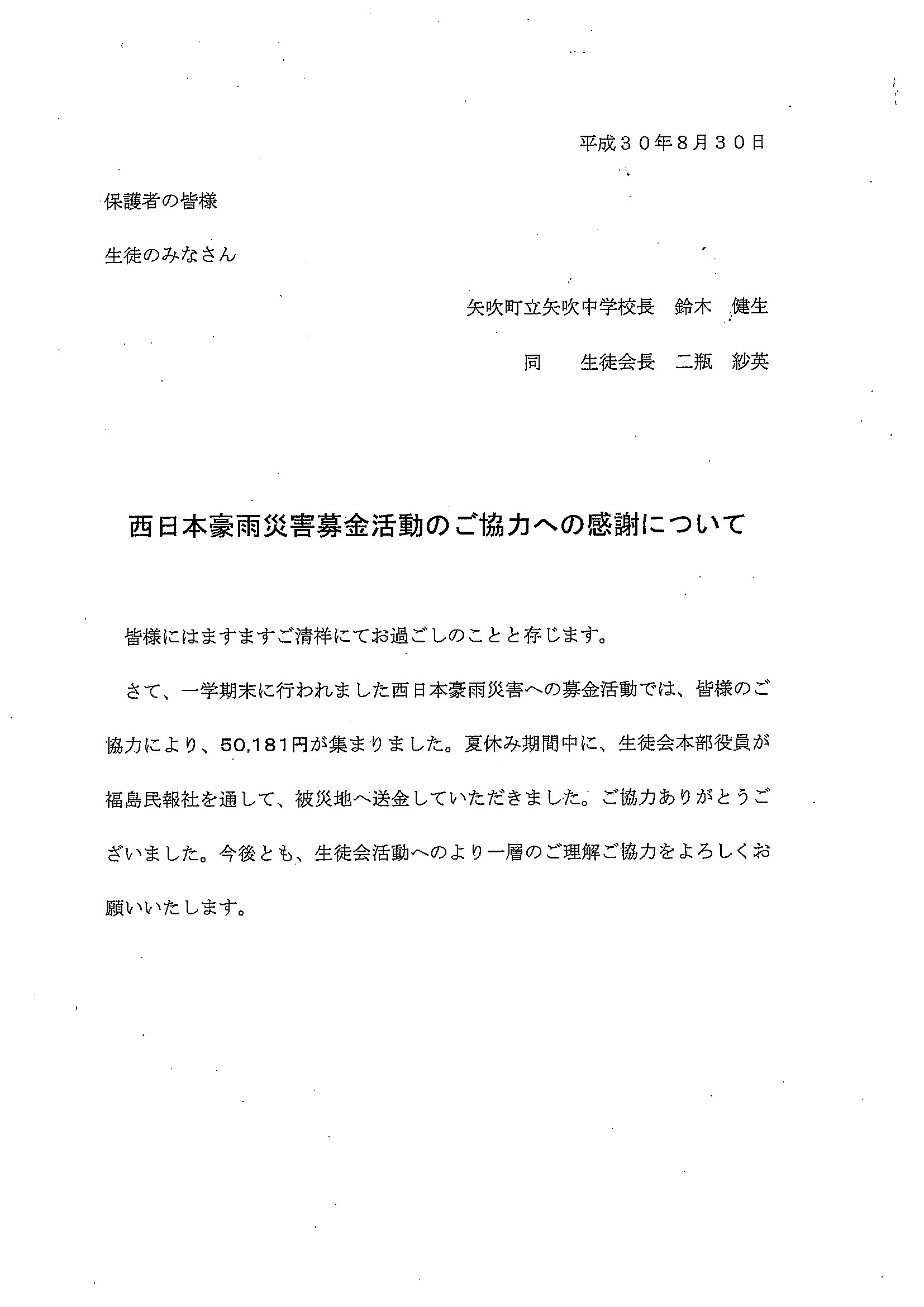 2018年8月30日 13時07分1学期末に行われました「西日本豪雨災害募金」について、皆様のご協力もあり